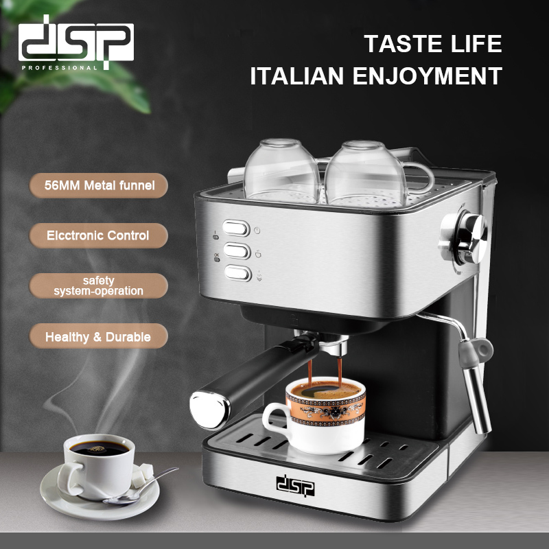 Кофемашина DSP Espresso Coffee Maker — современный кухонный прибор для быстрого приготовления кофе. По своим техническим характеристикам устройство максимально схоже с профессиональными кофемашинами. Прочный стальной корпус. Предусмотрен специальный встроенный венчик для взбивания молока.