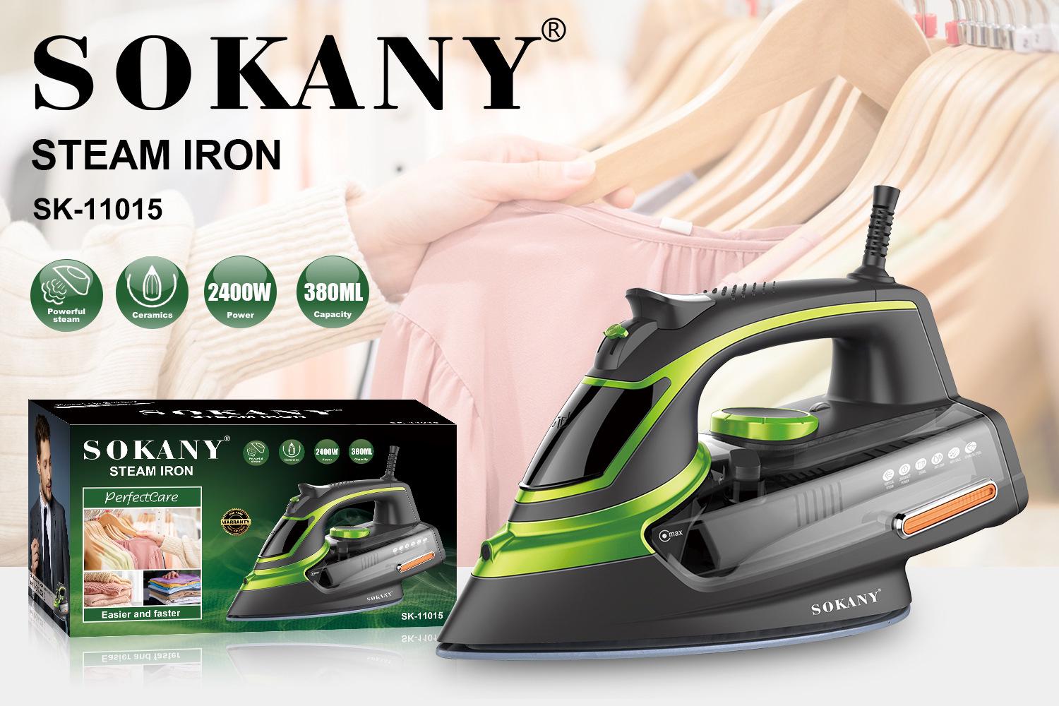 ● Sokany SK-11015 оснащен функцией парового удара, который помогает расправить плотные ткани и устранить сложные складки.