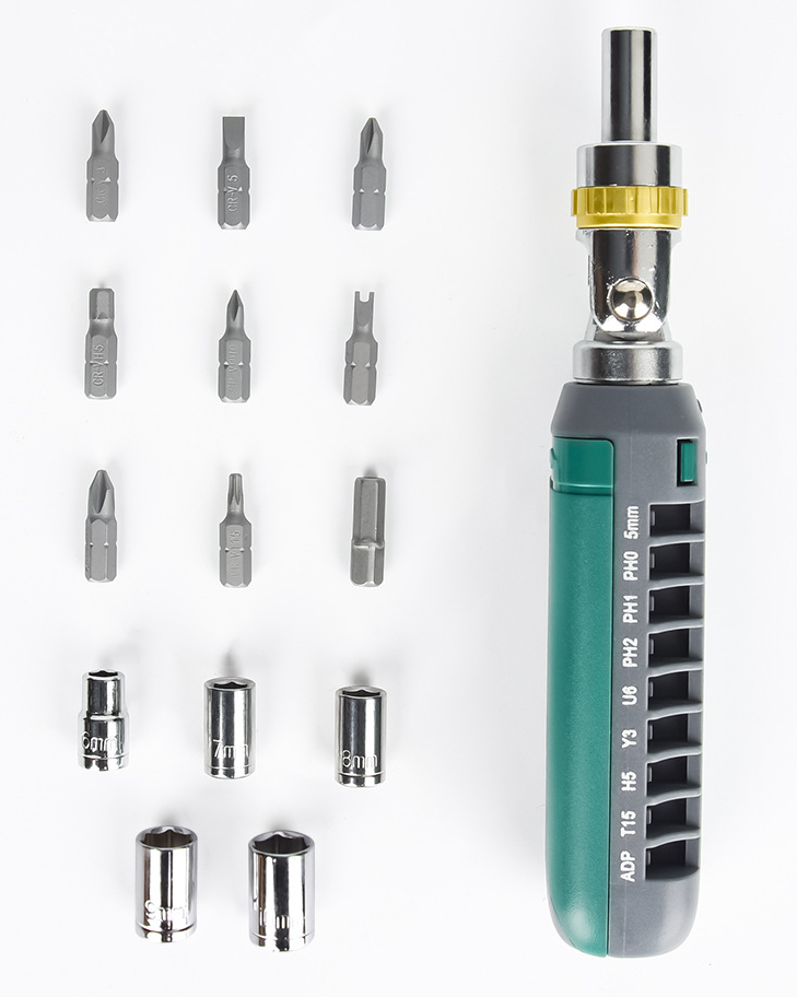 Многофункциональная отвертка 14 в 1 представляет собой спиральный инструмент с храповым механизмом, оборудованный различными 14 головками. Это обеспечивает универсальность при выполнении различных ремонтных заданий без использования нескольких инструментов.