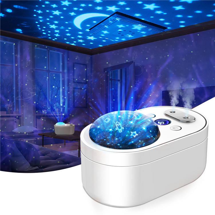 Цей пристрій пропонує два режими зволоження - постійний і переривчастий, а також може використовуватися як нічний світильник для дитячої кімнати. Проектор вбудований у пристрій вразить та порадує дитину, а також зацікавить будь-якого дорослого. Комплект поставки включає дві змінні проекційні плівки із зображеннями космосу та океану. Завдяки безшумній роботі його можна використовувати навіть під час сну дитини. Пристрій автоматично вимикається за відсутності води. Воно працює до 4 годин безперервно від порту USB, до 8 годин в інтервальному режимі і може бути підключено до ноутбуків та мережних зарядних пристроїв. Час роботи від акумулятора становить до 3 годин, і відсоток заряджання відображається на цифровому дисплеї.