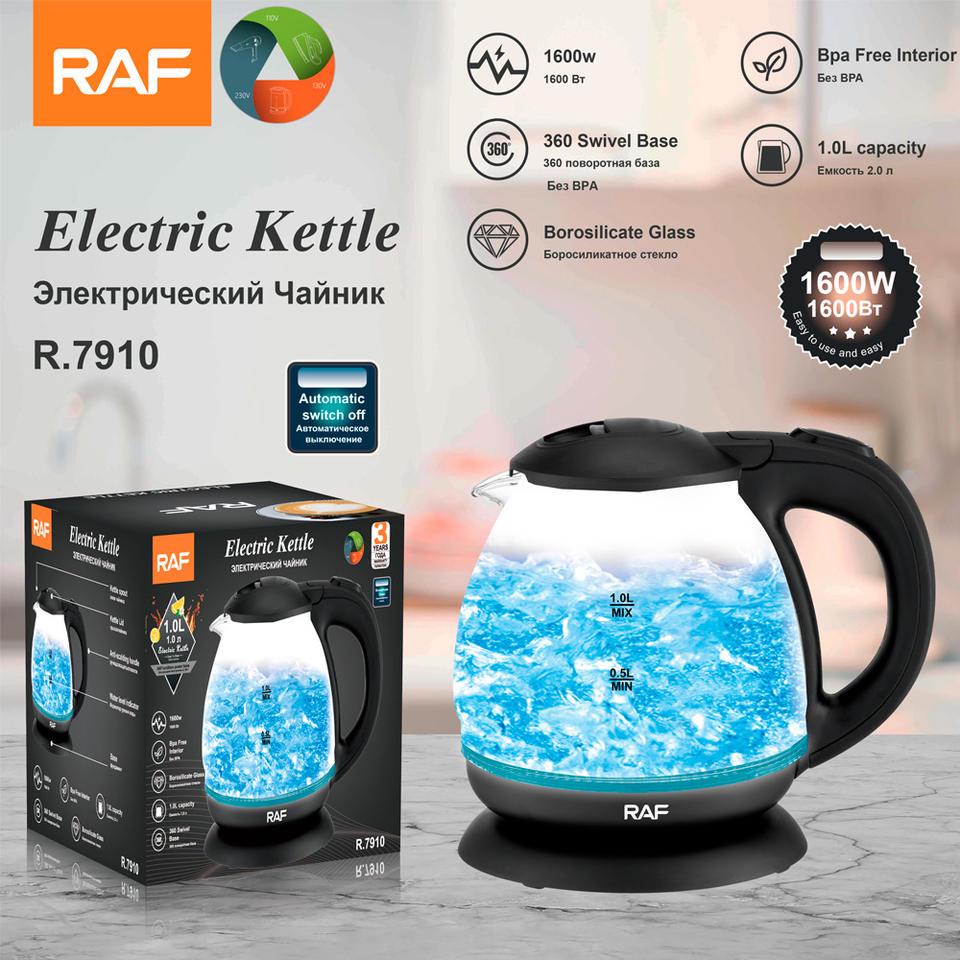 Електрочайник RAF R.7910 - чудовий помічник на вашій кухні. Корпус моделі виконаний з термостійкого загартованого скла, яке в поєднанні з ефектним світлодіодним підсвічуванням води, надає стильного зовнішнього вигляду.
