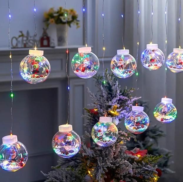 Світлодіодна гірлянда "Кулі з Дідом Морозом" виконана у форматі дворівневої бахроми у вигляді 10 ниток, що звисають, різної довжини зі світлодіодами, на кінці яких закріплені великі прозорі кулі. У кожному гарна, яскрава фігурка Діда морозу, дрібні кульки, що імітують іскристо-білий сніг і світлодіоди, що мерехтять гарним теплим світлом. Така новорічна гірлянда миттєво створює гарні новорічні вогні. Це ультрастильний та креативний LED декор.
