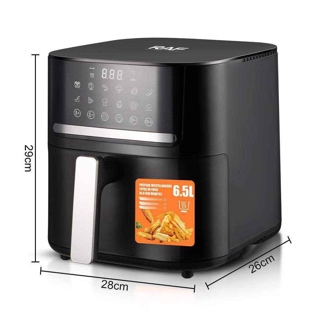 Аерофрітюрниця RAF 6.5 літрів з цифровим керуванням Гаряча сковорода, гриль та глибока сковорода для смаження у фритюрі Гриль, смаження, запікання та запікання розморожування Нежирне та щадне приготування з гарячим повітрям З термостатом та таймером Номінальна потужність 220-240 Вольт 1600 Вт Номінальний об'єм 6.5 літрів