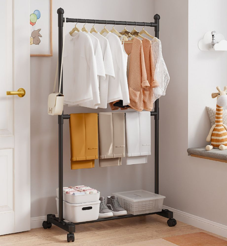 Вішалка для підлоги для одягу та взуття з міцного металу на колесах з чорним елегантним дизайном та зручною установкою ідеально підходить для оптимізації простору та зберігання різних предметів гардеробу в передпокої, спальні, коридорі або інших кімнатах.