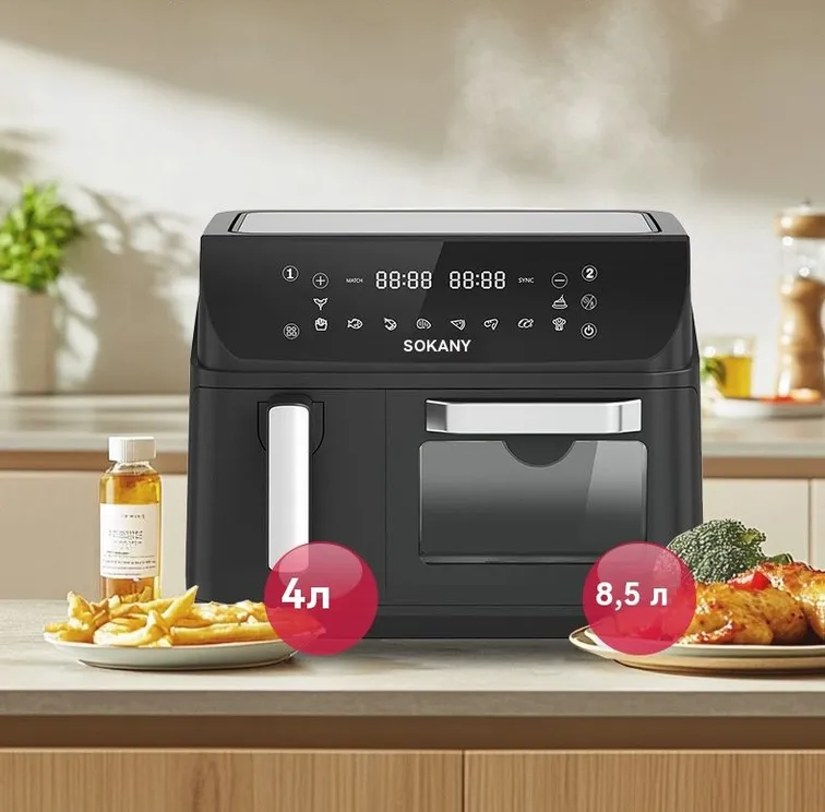 Аерофрітюрниця подвійна Sokany SK-10060 – це сучасний пристрій для приготування їжі без використання олії, що робить страви менш калорійними. Вона обладнана РК-дисплеєм та сенсорним екраном з поворотним перемикачем для зручного керування процесом приготування.